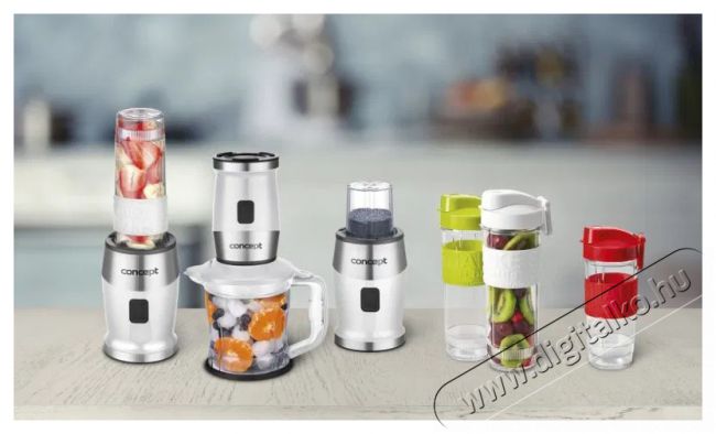A Concept SM3391 asztali turmixgép legfontosabb jellemzői- A készlet tartalmazza: turmixgép + 1200 ml-es aprítógép dupla pengével + fűszer- és kávédaráló + 3 keverőtartály: fehér 570 ml, zöld 570 ml és piros 400 ml