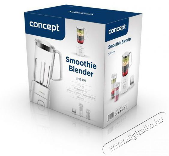 ConceptSM3491-Smoothie készítő Készíts ízletes leveseket, mennyei smoothie-kat, finom házi készítésű fagylaltot és még sok mást a Concept SM3491 turmixgéppel. A csomag három tartós tritánból készült keverőedényt tartalmaz - egy nagy literes edényt praktikus fogantyúval és két kisebb, utazáshoz ideális palackot. A keverőtartályok könnyen rögzíthetők közvetlenül a turmixgép testéhez. A rozsdamentes acél vágókések kivehetők és könnyen tisztíthatók. A Concept SM3491 turmixgép vezérlése nagyon egyszerű - egyetlen gombbal történik.