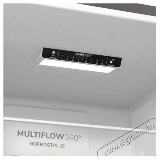 A készülék egyik kiemelkedő funkciója a NoFrost Plus technológia, amely teljesen fagymentes működést biztosít. A rendszer a fagyasztótérbe beépítve akadályozza meg a jég és a dér felhalmozódását, így nincs szükség kézi leolvasztásra, és az energiafogyasztás is alacsony marad. Emellett a Multiflow 360° légáramlás és az IonAir technológia