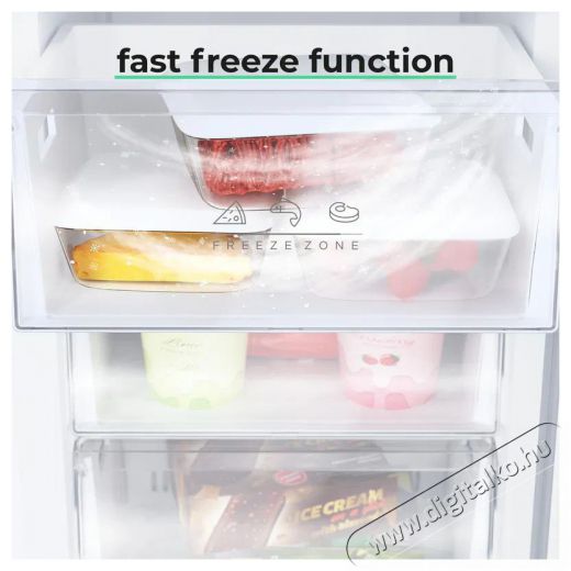 Nagy fagyasztó gyorsfagyasztás funkcióval A SIGURO BF-A241Y Premium kombinált hűtőszekrény 378 literes hasznos térfogattal rendelkezik, amelyből 122 litert a készülék alján található fagyasztó foglal el. A fagyasztótér három nagy kihúzható fiókkal van felszerelve, amelyek átlátszóak, és megkönnyítik a tárolt élelmiszerek átlátását. A gyorsfagyasztás - Fast Freeze - funkció automatikusan -24°C-ra állítja a fagyasztó hőmérsékletét, így az újonnan behelyezett élelmiszerek gyorsan lefagyaszthatók. A funkció aktiválásához egyszerűen nyomd meg a kezelőpanelen található megfelelő gombot. A hűtőszekrény maximum 24 órán keresztül marad gyorsfagyasztás üzemmódban, majd az üzemmód inaktiválódik, és visszaáll az eredeti fagyasztási hőmérséklet.
