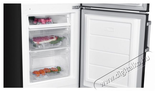 A 121 literes hűtőtér három edzett üvegpolccal van felosztva. Emellett a középső polc magassága állítható, és a tárolóhely igény esetén könnyen átrendezhető. Az ajtóban tágas rekeszeket találsz, amelyek a nagyméretű üvegek, befőttesüvegek, valamint kisebb élelmiszerek tárolására vannak fenntartva. Nem hiányozhat a kihúzható Crisper box sem a friss gyümölcsök és zöldségek tárolására, illetve egy riasztó, amely figyelmeztet, ha az ajtó nyitva marad.
