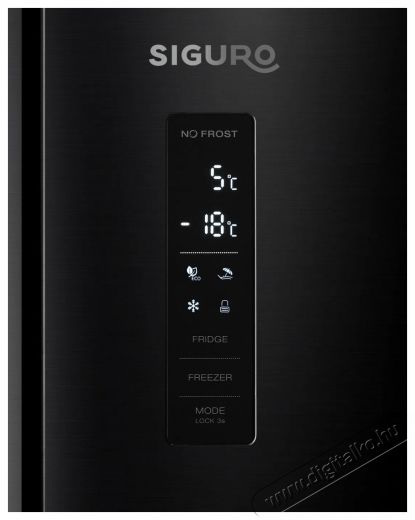 A hőmérséklet szabályozását az ajtón található áttekinthető érintőpanel biztosítja, amely lehetővé teszi a hűtő (2-8 °C) és a fagyasztó (-22 és -14 °C között) részek hőmérsékletének független beállítását. A panel 25 másodperc inaktivitás után és az összes ajtó bezárásakor automatikusan lezár. A feloldáshoz tartsd nyomva a MODE gombot 3 másodpercig. Rendelkezésre áll gyerekzár is, amely megakadályozza a beállítások véletlen módosítását. A Siguro LunoraE252Y hűtőszekrény riasztóval is fel van szerelve – ha az ajtót 90 másodpercnél hosszabb ideig nyitva hagyod, hangjelzés szólal meg, amely addig ismétlődik, amíg be nem zárod.