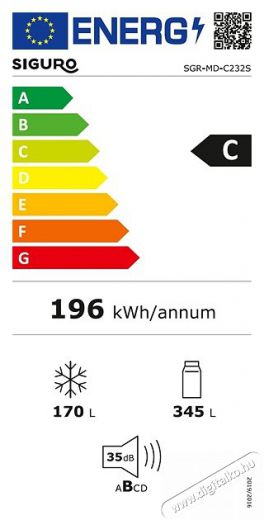 | Hűtőszekrény éves energiafogyasztása | 196 kWh/annum |