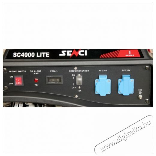 SENCI SC-4000 LITE 230V áramfejlesztő ideális választás háztartási vagy kereskedelmi felhasználásra, akár 13 órán keresztül működtethető megszakítás nélkül, AVR feszültségszabályzóval ellátva. Alacsonyolajszint jelző automatikusan leállítja a motort, ha alacsony olajszintet érzékel. Digitális feszültség, frekvencia és munkaóra számláló. Új, különleges kialakítású, kisebb levegőszűrő. Környezetbarát, csendes műküdés.
