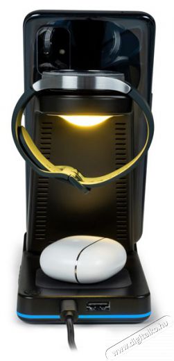 - 4 az 1-ben töltőállomás ( * ): 3 zónás indukciós töltő okostelefonhoz, Galaxy Smartwatch® + vezeték nélküli fülhallgató) + USB-A kimenet
