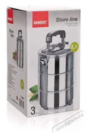 A BANQUET Culinaria Store Line A03149 kiváló segítséget nyújt ételhordáshoz. Ha rendszeresen jár étterembe vagy iskolai étkezdébe, garantáltan nagy hasznát veszi majd ennek a praktikus találmánynak. Akkor is jól jön, ha gyermeke lebetegszik és az iskolából szeretne hozni neki ebédet. A készlet három darab, 13 cm átmérőjű és 5,7 cm magas rozsdamentes acéledényt tartalmaz. A tervezők az edényeket összekapcsolták, a legfelső darabot pedig rozsdamentes acélfedővel látták el. Az edények és a felső fedél szoros lezárása érdekében egy fémtartót és egy csatot is felszereltek az eszközre. A készlet kiváló minőségű rozsdamentes acélból készült.