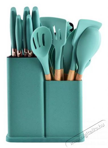 A készlet tartalma: Tojásverő, merőkanál, szedőkanál, ételfogó csipesz, spatula, ételforgató lapát, kenőecset,spagetti kiszedő,szűrőkanál, szedő lapát, krém spatula, szakácskés, kenyérvágókés, univerzális kés, szeletelő kés, hámozókés, konyhai olló, vágódeszka, állvány.