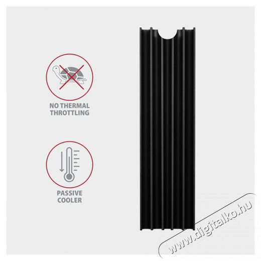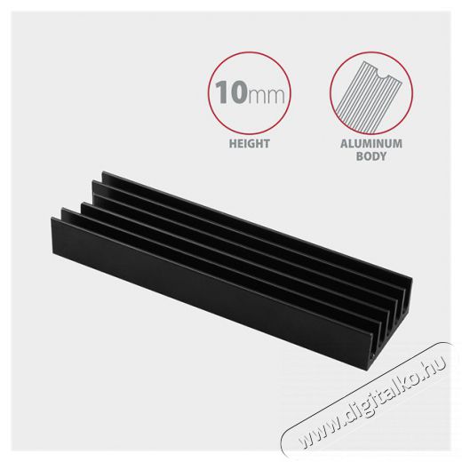 Az univerzális passzív hűtőborda M.2 kártyákhoz használható, mérete 22 x 80 mm. Két mellékelt hővezető párna lehetővé teszi a hűvösebb működést az összes egyoldalas és kétoldalas M.2 SSD lemezhez. A 10 mm magas bordázott alumínium hűtőborda az M.2 SSD műveletei során keletkező hő jobb elvezetését segíti elő. Emellett akár 25°C-kal is csökkenti a működési hőmérsékletét. Ez meghosszabbítja az M.2 SSD élettartamát, és megakadályozza a lemez lelassulását, az úgynevezett "Thermal Throttling". Könnyű telepítésének és kompakt méreteinek köszönhetően a hűtőborda nemcsak az M.2 AXAGON adapterekkel, hanem az alaplapokon lévő M.2 (NGFF) nyílásokkal is használható.  A 10 mm-es magasságnak köszönhetően a hűtő maximális hűtési hatékonyságot ér el.