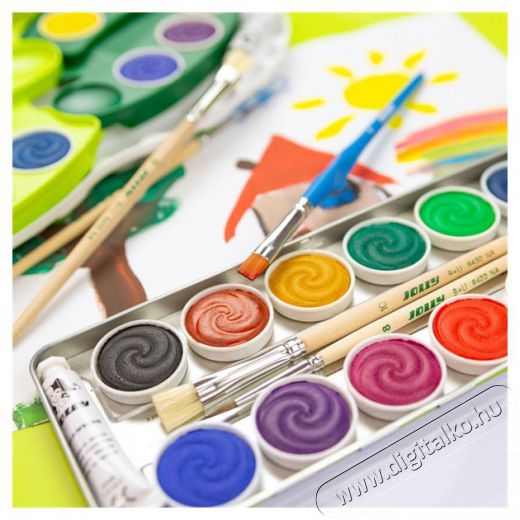 12 darabos extra színkoncentrációjú vízfesték készlet, extra nagy vízfesték gombokkal fémdobozban. A vízfesték gombok dombornyomásúak, ami segíti a gyerekeket a helyes ecsetkezelésben, ecsetforgatásban.
