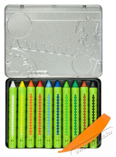 10 darabos zsírkréta készlet fémdobozban. Minden egyes zsírkréta műanyag krétafogóban van, ami lehetővé teszi a könnyű adagolást, illetve tisztán tartja a kezeket. A készlet tartalmaz egy műanyag kaparót is réteges kaparós technikához