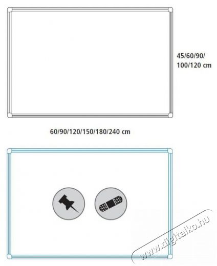 A termék nevében megadott méretek a tábla teljes szélességét és magasságát jelzik, beleértve az alumíniumkeretet is, amely körülbelül 2 cm széles. A hasznos terület méretei ezért mindig kb. 4 cm-rel kisebbek.