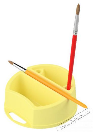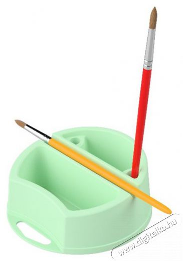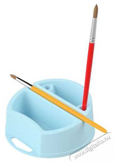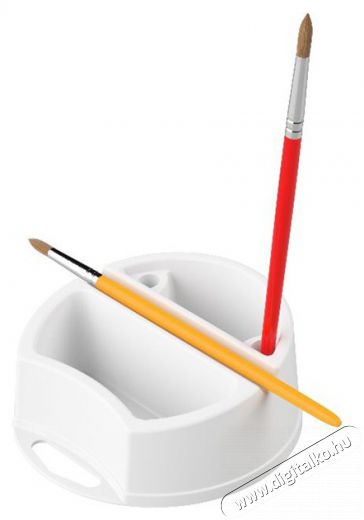 Műanyag ecsettál két vizes rekesszel, öt színben. Kialakításának köszönhetően normál használat mellett nem felborítható. Három ecsettartó hellyel. Könnyen kimosható. A szín nem választható.