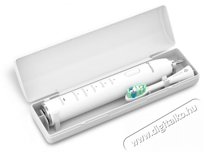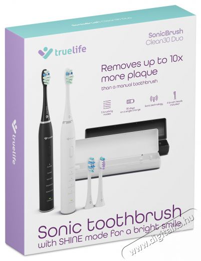 TrueLife SonicBrush Clean30 Duo - Tökéletes szájhigiénia két személynek Ismerd meg a TrueLife SonicBrush Clean30 Duo elektromos fogkefét - egy kényelmes kétszemélyes szettet, amely egyesíti a szónikus technológia erejét az egyszerű vezérléssel. Mindkét fogkefe öt tisztítási módot kínál (Clean, Shine, Whiten, Massage, Sensitive), és percenként akár 70 000 rezgést is végezhet. Az eredmény a fogak és az íny alapos, mégis kíméletes tisztítása. A csomagban két kefetest, cserefejek és egy töltőalap található, hogy a együtt használva is garantálja a kényelmet. A TrueLife SonicBrush Clean30 Duo elektromos fogkefe hosszú, akár 30 napos akkumulátor-élettartamával kiválóan alkalmas útközbeni használatra.