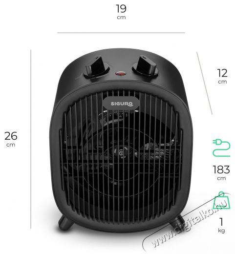 Két teljesítményszint és ventilátor funkció A tekerőgombbal két fűtési teljesítményszintet állíthatsz be - 1 200 és 2 000 W-ot. Egy fokozatmentesen állítható termosztát is rendelkezésre áll. A tekerőgombbal beállíthatod az optimális fűtési hőmérsékletet a saját igényed szerint. Értékelni fogod a praktikus hideglevegő funkciót, ahol csak a ventilátor működik, a fűtőelem pedig ki van kapcsolva. A Siguro HS-F100B Shrew ventilátor működését egy fényjelző jelzi.