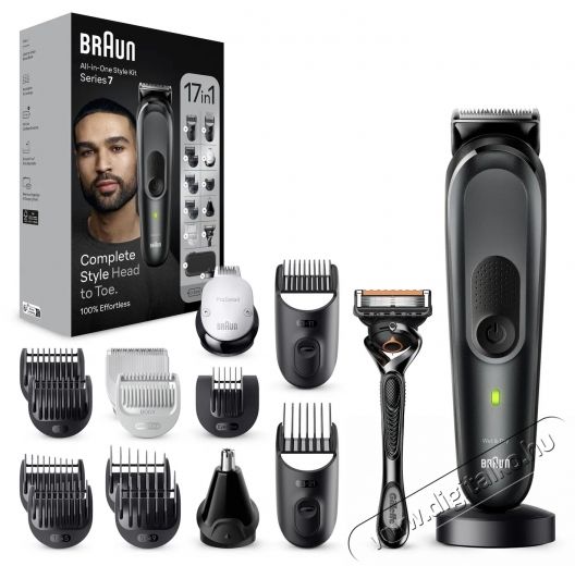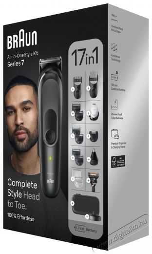 A BRAUN Series 7 MGK7491 trimmelő készlettel tökéletes haj-, szakáll-, arc- és testápolást valósíthatsz meg – szalonszintű eredménnyel otthonod kényelméből. A ProBlade pengének és az intelligens AutoSense technológiának hála a trimmelő automatikusan alkalmazkodik a szakáll sűrűségéhez és hosszához, így minden húzásnál sima, precíz nyírást biztosít. A 17 minőségi feltéttel, akár 100 perc vezeték nélküli működéssel és vízálló kialakítással minden megvan, amire szükséged van a tökéletes formázáshoz és a könnyű mindennapi ápoláshoz.