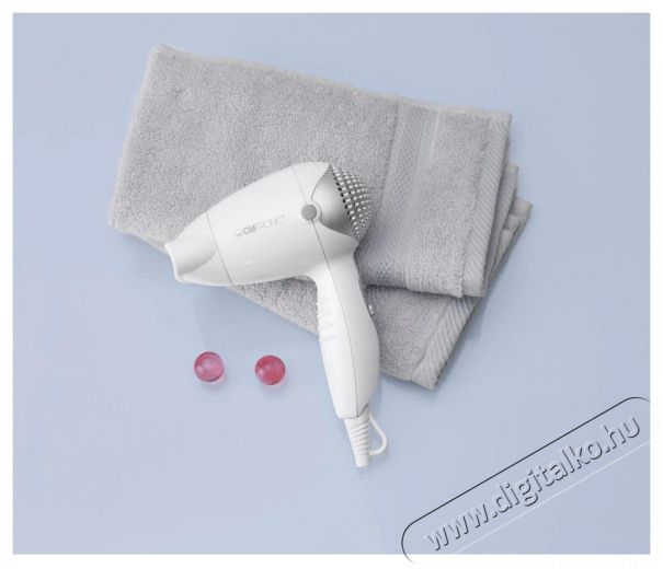 A praktikus Clatronic utazó hajszárítót bárhová magaddal viheted, így bárhol  gyorsan megszáríthatod a hajad, ráadásul két hőmérséklet-fokozat közül is válaszhatsz. A készülék tartozéka a levehető, 360 fokban forgatható diffúzor. A hajszárítót természetesen túlmelegedés elleni védelemmel is ellátták, az egyszerű tárolásról pedig az akasztó gondoskodik. Hajlított formájú, gumírozott felületű markolata kényelmes és biztonságos fogást biztosít.