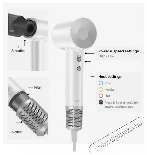 Állítható hőmérséklet és két sebességfokozat: ezt kínálja a Laifen Swift Special pearl white hajszárító A Laifen Swift Special piros hajszárító három hőmérsékletszinttel rendelkezik. Választhatsz Cold, azaz hideg fokozatot, amely a szobahőmérsékletnek felel meg, Warm, vagyis meleg fokozatot, amely eléri az 50°C-ot, és Hot, azaz forrót, amely 80°C-os levegőt fúj. A Laifen Swift Special pearl white hajszárító két sebességfokozata közül az egyiket könnyedén kiválaszthatod.