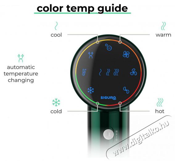 A Siguro HR-I450W Forest Flow hajszárítóval négyféle hőmérséklet közül választhatsz. Teljesítményét így a hajtípusodhoz igazíthatod, és mindig gyors, tökéletes eredményeket érhetsz el. A markolaton található gomb segítségével alacsony, közepes, magas hőmérsékletet állíthatsz be, vagy hideg levegőt a frizura végső rögzítéséhez. Rendelkezésre áll egy váltakozó meleg és hideg levegő üzemmód is. A kiválasztott hőmérséklet a színkódolt kör alakú kijelzőn jelenik meg.