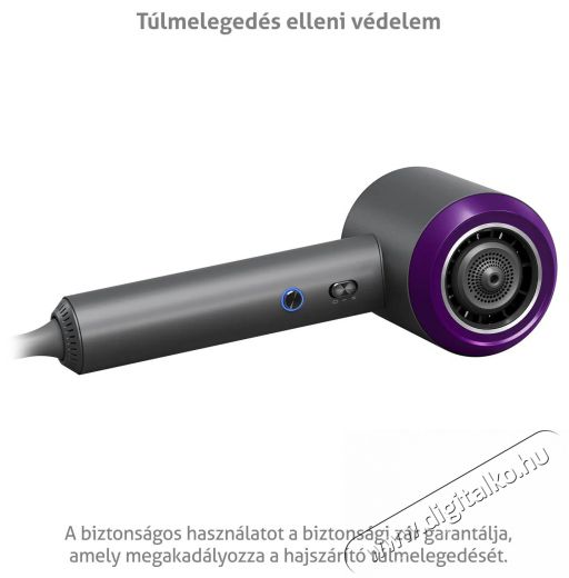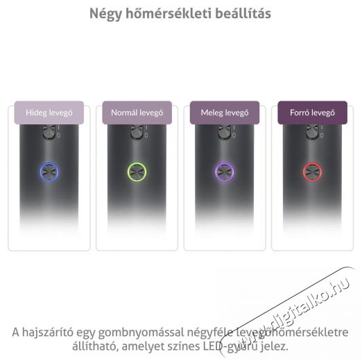• A hajszárító gombja körüli színes LED-gyűrű jelzi és színkódolja a levegő hőmérsékletét szárítás közben