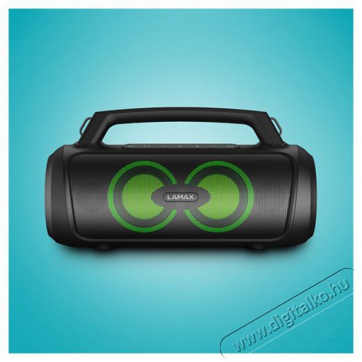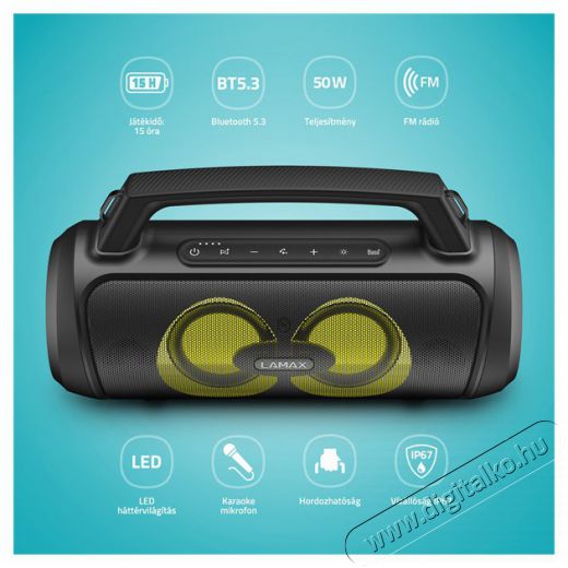 | Funkció | Power bank funkció USB-A porton keresztül, dalvezérlés (Lejátszás/Szünet, Következő/Előző dal), Hangerőszabályzó, Telefonhívás-szabályozás (Bejövő hívások fogadása/elutasítása, Hívás befejezése), Hangsegéd támogatás (Siri, Google Assistant), TWS funkció, LAMAX BeatBass® technológia, moderálás + karaoke mód mikrofonnal, FM rádió |