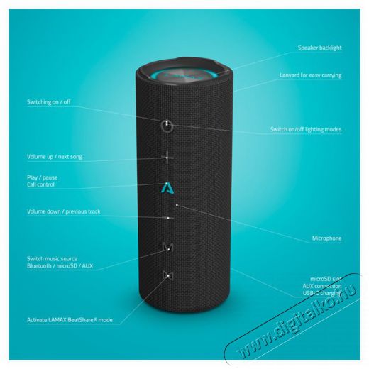 Találd meg a megfelelő hangulatotA vezeték nélküli kapcsolódás legújabb verziója, a Bluetooth 5.3 lehetővé teszi, hogy akár 18 méteres távolságból is ellenőrizd a lejátszási listádat. Az általunk kifejlesztett LAMAX BeatShare® technológia is egy praktikus funkció, amely lehetővé teszi két LAMAX hangszóró összekapcsolását, így azonnal megduplázódik a hangzás, a teljesítmény és a szórakozás. Ráadásul az integrált világítással is feldobhatod az éjszakát - öt színárnyalat közül választhatsz, amelyek automatikusan szinkronizálódnak a ritmussal, bárhol táncparkettet teremtve.