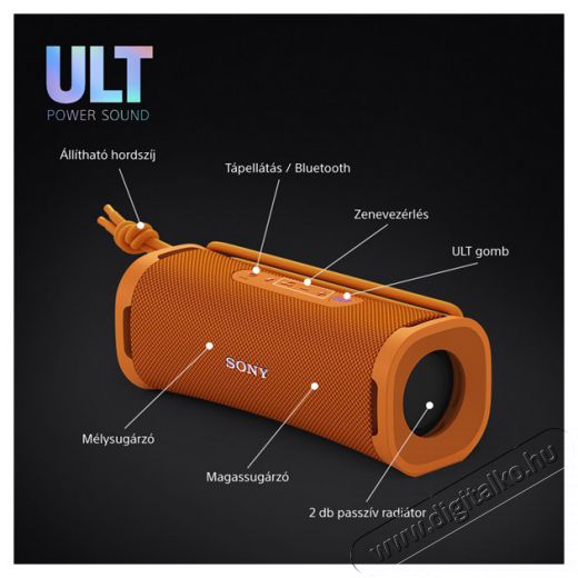 Az ULT POWER SOUND sorozat legkisebb és leghordozhatóbb Bluetooth hangszórójaA Sony ULT FIELD 1 hordozható Bluetooth hangszóróval bárhol élvezheti kedvenc zenéjét, legyen szó otthonról, a parkban, a medence mellett vagy a strandon. Az IP67 minősítéssel a víz, a por és a homok nem tesz kárt benne. Emellett a Sony hangszóró fokozottan ellenáll az ütéseknek, ütéseknek és karcolásoknak. A kültéri hangszóró minőségi mélysugárzóval, magas hangszóróval és két passzív sugárzóval rendelkezik. Ezért kiváló minőségű hangzást kap, de ha ez még mindig nem elég, nyomja meg az ULT gombot az ULT POWER SOUND üzemmód aktiválásához, amely felerősíti a basszust és növeli a hangnyomást az energikus hangzás érdekében. A Sony kültéri hangszóró funkciói közvetlenül a hangszórón vagy a Sony | Music Centre alkalmazással telepített, párosított készüléken keresztül vezérelhetők. És mivel a Sony ULT FIELD 1 Bluetooth hangszóró beépített mikrofon Echo Cancellation technológiával rendelkezik, így még a hangos kihangosított hívások is kristálytisztán szólalnak meg. A Stereo Pair funkcióval két Sony ULT FIELD 1 hangszórót csatlakoztathat, hogy valódi sztereó hangzást hozzon létre.