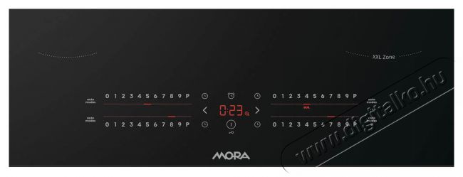 Egy XXL zóna - Új zóna kedvenc edényeid és serpenyőid számáraA nagy főzőzóna a MORA VDIS 655 C főzőlap elülső részén található, és pontosan 23 cm átmérőre tervezték, ami a leggyakrabban használt edények és serpenyők mérete. Ez a zóna egyenletes melegítést biztosít hideg pontok nélkül és maximális kényelmet nyújt főzés közben. A funkció kiválasztott indukciós főzőlapoknál érhető el, és hozzájárul a hatékonyabb és kellemesebb főzéshez.
