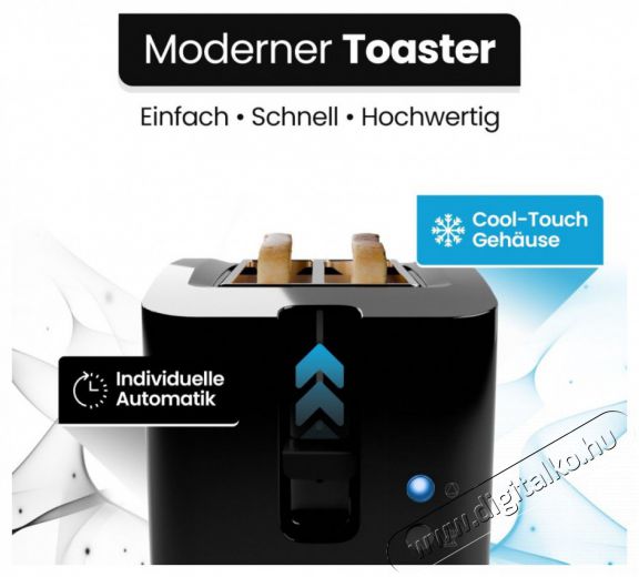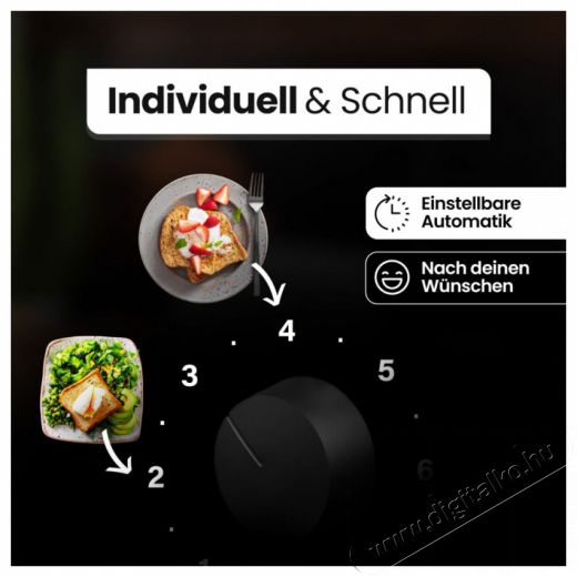 A folyamatosan állítható barnulási fokozat lehetővé teszi, hogy mindenki a saját ízlésének megfelelően állíthassa be a pirítást. A készülék rendelkezik olvasztás, újramelegítés és gyors leállítás gombbal, automatikus és kézi kikapcsolással egyaránt.