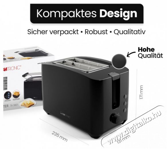 Sokoldalú konyhai segítőA TA 3801 kompakt, kétszeletes kenyérpirító ideális választás reggelizéshez. Nem csupán kenyérszeletekhez, hanem péksüteményekhez és előre sült gofrihoz is kiválóan alkalmas.