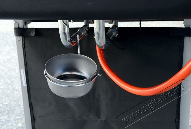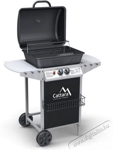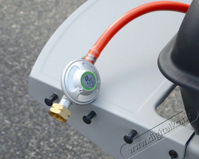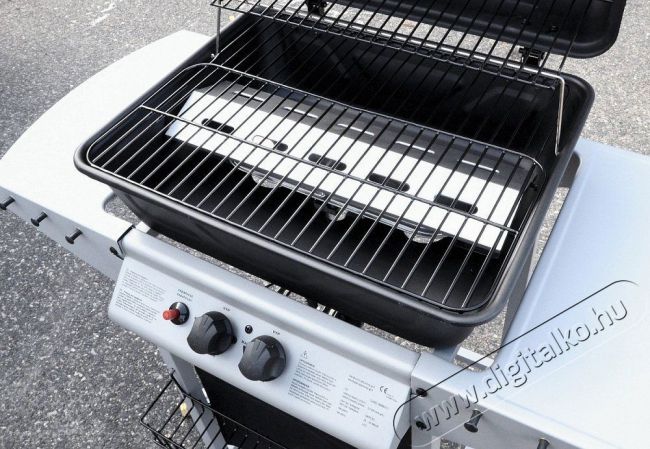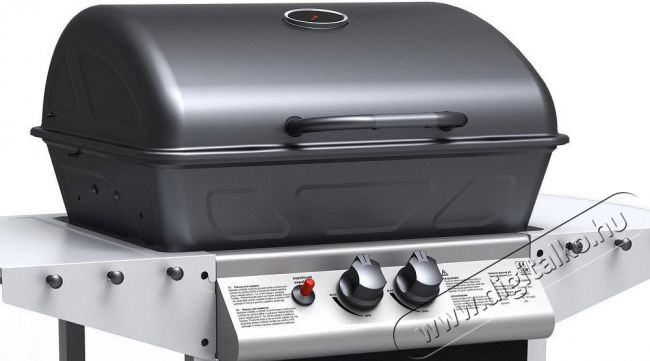 Dupla főégő. Rozsdamentes acél égők piezo gyújtással és fokozatmentes szabályozással. A grillsütő mobil (2 kerék), csuklós fedéllel és mindkét oldalán tárolópolcokkal van felszerelve. A gázpalackhoz csatlakozó tömlő és egy nyomáscsökkentő szelep is tartozik hozzá. A lehajtható oldalsó polcoknak köszönhetően a grill könnyen tárolható.