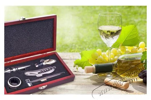 Borozó szett - rozsdamentes acél, üveg, fa. A készletben található késsel ellátott összecsukható dugóhúzó, szalvétagyűrű, dugó, tölcsér, hőmérő. Méretek: 23 × 13 × 4,5 cm.