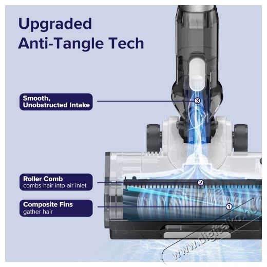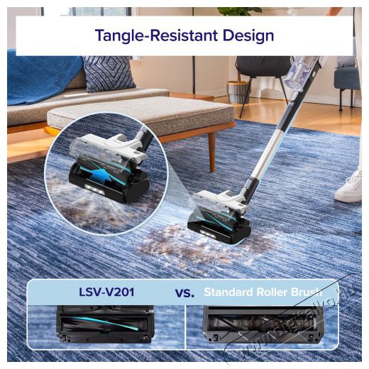 A Levoit LVAC-200 álló porszívó forgókeféje úgy lett kialakítva, hogy ne kelljen fáradságosan kibogozni a haj- és szőrszálakat, miközben textil- és gumilamellái hatékonyan segítenek azok eltávolításában.