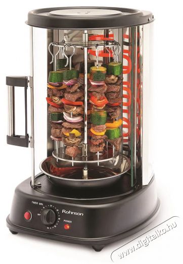 A ROHNSON R-2530 függőleges grill nagyszerű segítőtárs csirke, gyros, nyársak, halak és zöldségek készítéséhez. Teljesen üveg tolóajtajának köszönhetően végig figyelemmel követheted a grillezés folyamatát. A készülék a felesleges zsír számára csepegtető tállal is el lett látva. A 21 literes belső tér 35 x 21 cm-es (Ma x Szé) hasznos területet biztosít. A grill használata rendkívül egyszerű, egyszerűen csatlakoztasd, állítsd be az időt (legfeljebb 60 percig) és a többit hagyd a készülékre. A ROHNSON R-2530 a hőteljesítményt szabályozó gombbal is fel lett szerelve.