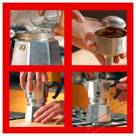 Az alsó edényt töltsd meg vízzel a jelölésig, majd helyezd rá a szűrőt. Öntsd bele az őrölt kávét. Rögzítsd a harmadik, felső részt, majd a kávéfőzőt tedd a tűzhelyre vagy a főzőlapra. Úgy rakd rá a gáztűzhelyre, hogy a lángok ne érhessék el a kávéfőző felső részét. Amikor a víz az edényben elkezd forrni, a kávé belecsöpög a felső kiöntőbe. Ezután csak öntsd a tartalmát egy csészébe és élvezd a feledhetetlen, finom ízű kávét.