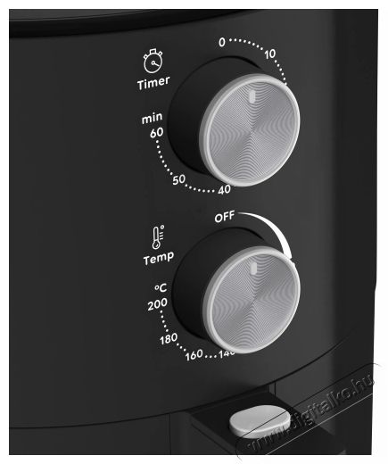 Egyszerű vezérlés a Home AF-C300 Air Fry forrólevegős sütőnA vezérlés két forgatógombbal történik, amelyekkel beállíthatod az elkészítési időt (1–60 perc) és a hőmérsékletet (80–200 °C között). A beállított idő leteltével hangjelzés figyelmeztet, és a készülék automatikusan leállítja a fűtést. A biztonságos használatról hűvös tapintású fogantyú és hővédelmi biztosíték gondoskodik, így teljesen nyugodtan főzhetsz vele.