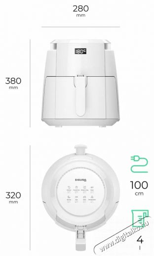 Siguro AF-P351W Vita Fry Plus airfryer A Siguro AF-P351W Vita Fry Plus airfryer a 8 előre beállított programmal és a 360°-os forrólevegő-áramlási technológiával könnyedén elkészítheti kedvenc sült ételeid egészséges változatát. A forrólevegős sütéshez csak minimális olaj szükséges, így sokkal egészségesebb, mint a hagyományos olajbansütés. A tartály teljes térfogata 4,7 liter, ebből a 4 teljes litert a sütőkosár foglalja el, amely levehető fogantyúval rendelkezik és mosogatógépben mosható. Stílusos matt kivitelével a Siguro airfryer tökéletesen illik minden modern konyhába.