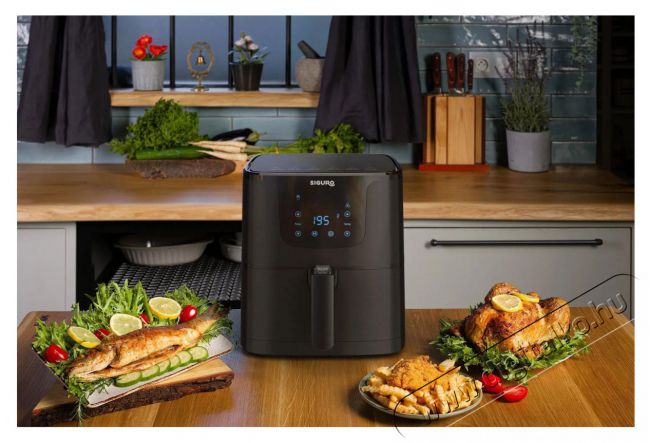 A tágas sütőkosár megkönnyíti az ízletes és egészséges ételek elkészítését egy nagy család vagy baráti társaság számára. A Siguro fritőz gyönyörű matt fekete kivitelével is lenyűgöző és tökéletesen illeszkedik minden modern konyhába.