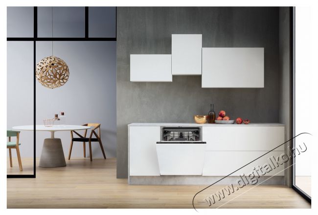 A teljesen integrált mosogatógép rendkívül stílusosan hat és nem zavarja meg a konyha egységes kinézetét.