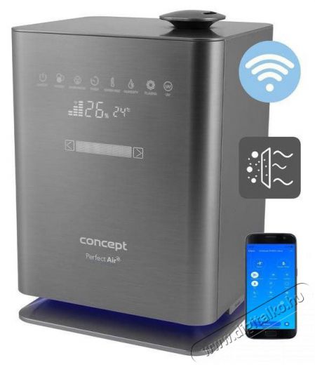 Concept ZV2021 Perfect Air Smart felhasználóbarát LED kijelzővel és Concept Home mobilalkalmazással A Concept ZV2021 Perfect Air Smart párásító vezérlése nagyon egyszerű, hiszen inden kényelmesen beállítható a LED-es érintőképernyős kijelzőn, amely a helyiség aktuális páratartalmát és hőmérsékletét is mutatja. Figyelmeztet arra is, ha nincs elegendő víz a tartályban. Választhatsz hideg vagy forró gőz között. Szükség esetén szabályozhatod az áramlást és a páratartalom intenzitását is. A kijelzőn található praktikus időzítőt könnyen beállíthatod akár 12 órára is. A Concept ZV2021 Perfect Air Smart párásító egyik előnye a készülék vezérlésének lehetősége a Concept Home mobilalkalmazáson keresztül, amelyet ingyenesen letölthetsz iOS és Android rendszerre is, így a párásítót bárhonnan és bármikor vezérelheted telefonon keresztül. Sőt, praktikus távirányítót is tartalmaz
