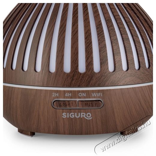 Siguro Aroma Glow WiFi R650DW aroma diffúzorA Siguro Aroma Glow WiFi R650DW aroma diffúzorral könnyedén kellemes hangulatot teremthetsz, és kedvenc illatoddal töltheted meg otthonod, akár relaxálás, munka vagy esti pihenés közben. Modern dizájnja visszafogott fa dekorációval elegáns és harmonikus megjelenést kölcsönöz minden belső térben – a hálószobától az irodáig. A nagy, 400 ml-es tartályának köszönhetően akár 4-5 órán keresztül képes folyamatosan párásítani a levegőt, így kiválóan alkalmas akár 40 m²-es helyiségekhez is. A WiFi mobilalkalmazáson keresztüli vezérlés lehetősége sem hiányzik, amelynek köszönhetően bárhonnan be- és kikapcsolhatod a diffúzort, módosíthatod az intenzitást vagy beállíthatod a háttérvilágítástközvetlenül a telefonodról.