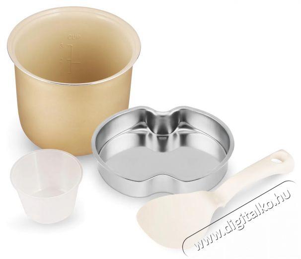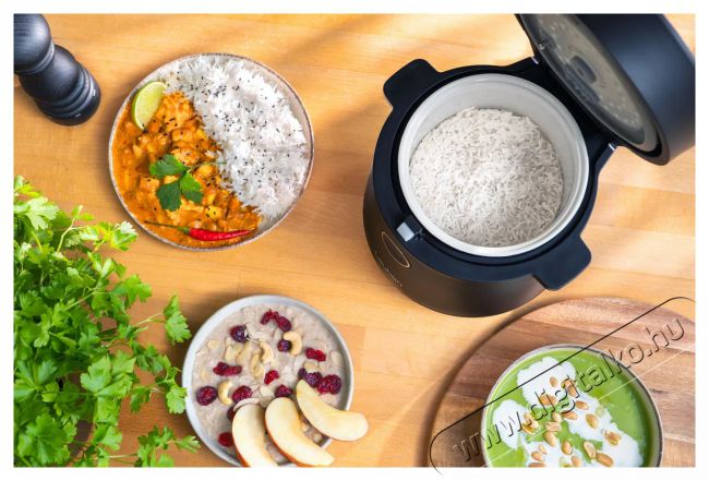 Kilenc előre beállított programmal rizst, leveseket, kását és más ételeket készíthetsz. A kerámia tapadásmentes felülettel ellátott belső edény mosogatógépben mosható, így időt takarít meg számodra. A Keep Warm funkció melegen tartja az ételt, a Cool Touch technológia pedig biztonságos használatot ígér. A csomag tartalmaz egy rozsdamentes acél gőzölőt is a gőzöléshez.