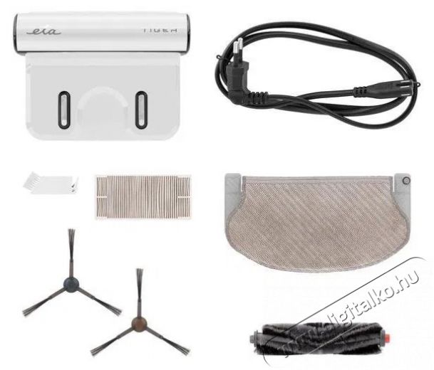 Az ETA Tiger 4242 90000 porszívó tartozékaiAz ETA Tiger 4242 90000 robotporszívóhoz tartozékok széles választéka is tartozik. A csomag tartalmaz egy töltőalapot, adaptert, víztartályt és felmosórongyot is. Természetesen vannak hozzá oldalsó kefék, főkefe és porgyűjtő tartály is.
