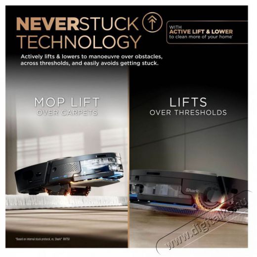 Nem kell ellenőrizned, hogy a Shark® robotporszívó nem akadt-e el valahol. A NeverStuck technológia lehetővé teszi, hogy a készülék könnyedén leküzdje az akadályokat. Innovatív kialakításának köszönhetően szőnyegeket, párnákat és egyéb durva felületeket is képes tisztítani.