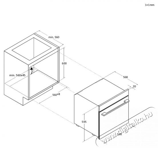 • Szükséges beépítési méret (minimális nyílás): 590 × 560 × 560 mm