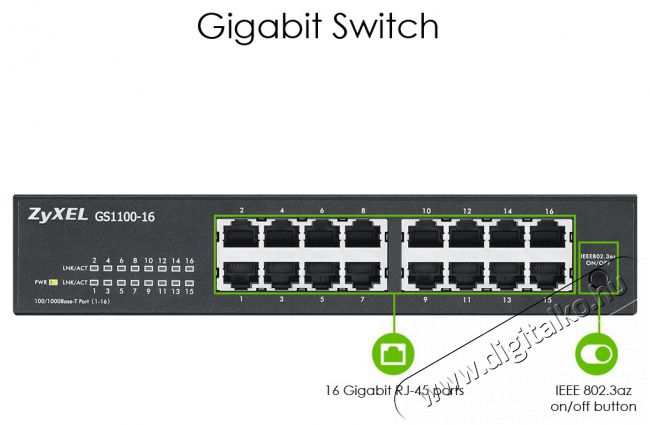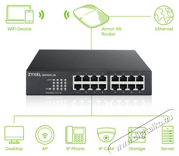Termék neve Zyxel GS1100-16 Beállítást nem igénylő (unmanaged) Gigabit Ethernet (10/100/1000)