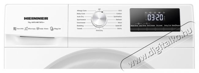 | Tulajdonság | Gyermekzár Késleltetett indítás Szárítási szint kiválasztása Szösz szűrő tisztítása kijelző Teli víztartály jelző Vízelvezetés |