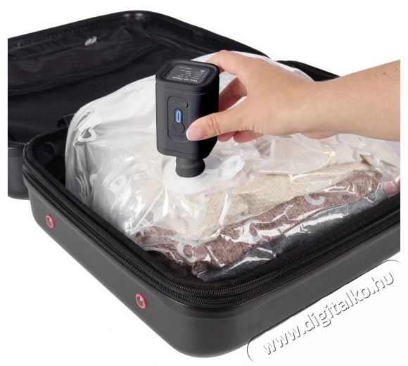 Compactor utazáshoz, szívó-fúvó berendezésA Compactor utazási vákuumszivattyú gyorsan és egyszerűen képes kiszívni a levegőt a vákuumtasakokból. A levegő kiszívása mellett a kétirányú funkciónak köszönhetően tárgyak felfújására is alkalmas. Használhatod ruhák és textíliák vákuumtasakban történő tárolására, levegő kiszívására, valamint olyan felszerelések felfújására, mint a napozóágyak, matracok, úszógumik, vízijátékok vagy léggömbök. A szivattyú USB-n keresztül tölthető. Kompakt méretének köszönhetően könnyen magaddal viheted utazásra is, és bármilyen bőröndbe vagy csomagba belefér. A tartós fekete felületkezelés hozzájárul a hosszú élettartamához.