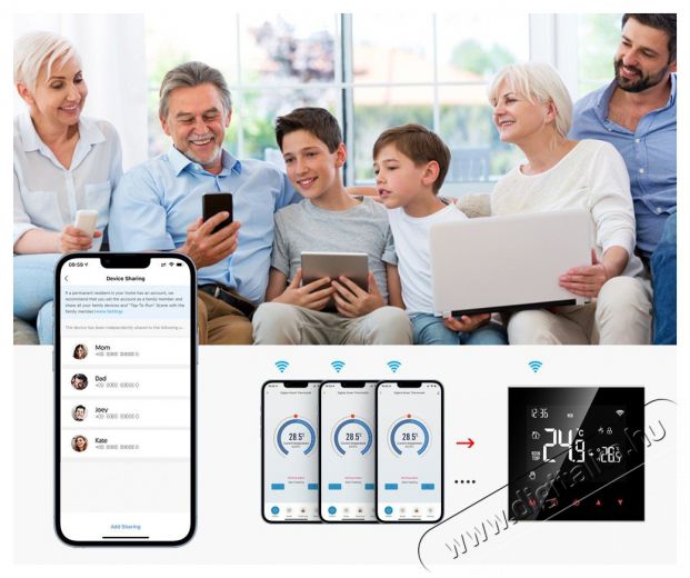Az AVATTO termosztátot az egész családhoz csatlakoztathatod. Egy telefon több termosztátot is vezérelhet, és egy termosztát több mobiltelefonról is vezérelhető.