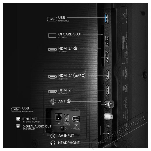 | Be- és kimenetek | CI+, HDMI 2.1, Kompozit, LAN, USB |