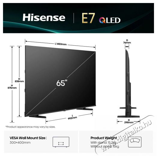 Hisense 65E7Q televízióÉlvezd a tökéletes képet és a magával ragadó hangzást a QLED, Dolby Vision és Dolby Atmos technológiával ellátott Hisense televízióval. A kép a Quantum Dot technológiának köszönhetően élénk színekkel tűnik ki, az intelligens 4K AI upscaling pedig a hétköznapi tartalmakat kiváló vizuális élménnyé varázsolja. Az AI Smooth Motion és a MEMC tökéletesen sima, elmosódásmentes mozgásmegjelenítést biztosít. Az automatikus Game Mode Plus játékmód VRR-rel és HSR-rel garantálja a tökéletes játékreakciót. Az okos funkciók, köztük a hangvezérlés, a tartalommegosztás és az intuitív VIDAA Smart TV környezet segítségével te irányíthatod a szórakozást - amikor és ahogyan csak akarod.